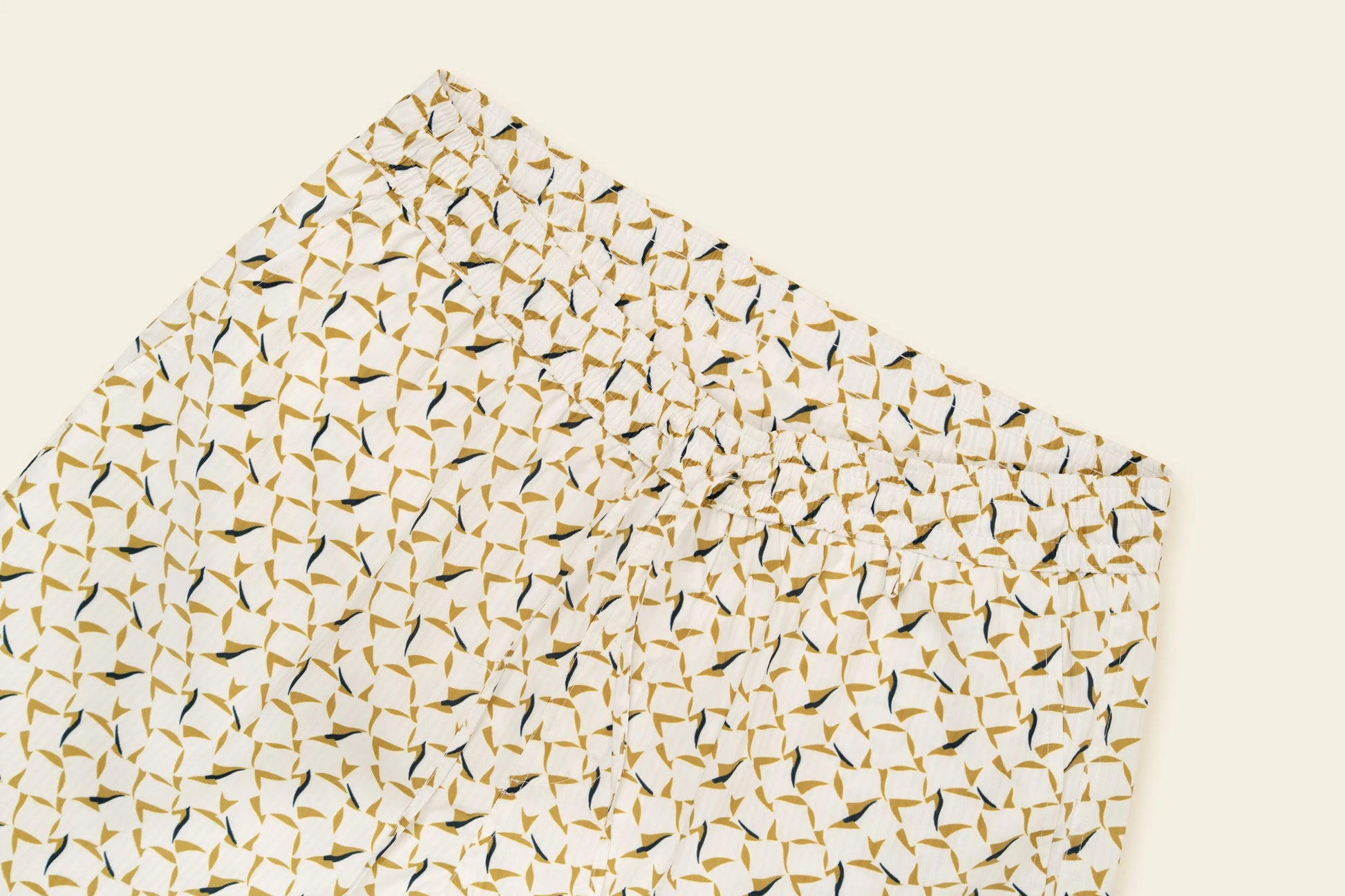 Short mare dal taglio sartoriale in leggera e resistente tela seersucker di poliestere riciclato, dalle texture naturali. Il modello Aurea è proposto in elegante fantasia vele bianco/senape.